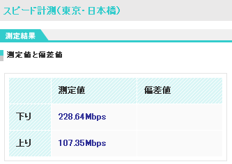 平日ひる | 下り 228.64Mbps 上り 107.35Mbps |