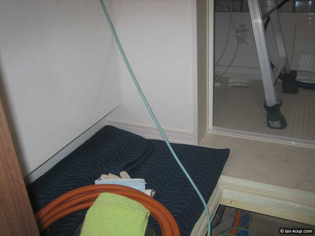 ここでの作業内容は1F浴室天井裏から隣接する居室へ床下を経由してのCD管配管です。洗面脱衣所に床下点検口が設置されている状況となります。具体的には