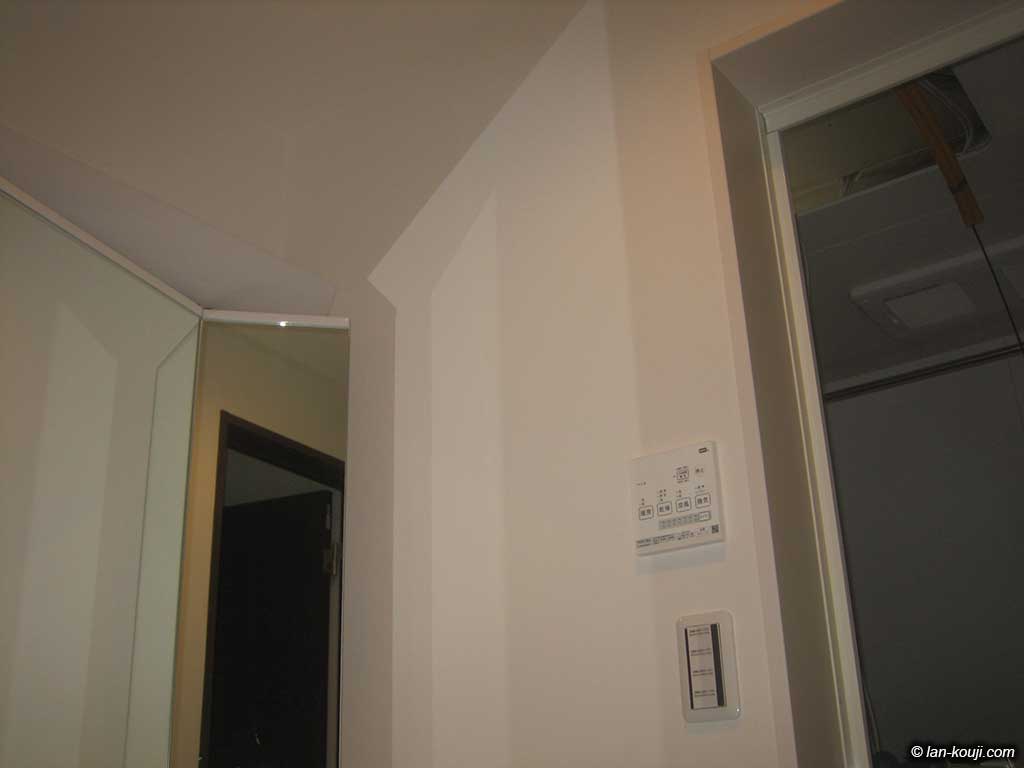 浴室天井裏の様子です。 石膏ボードが全面に貼られていて見渡すことができません。見えている白いコードは浴室乾燥機や換気扇をコントロールするパネルにつながっているものです。 このコードと同じように、CD管が通るくらいの穴をあけて通します。 |