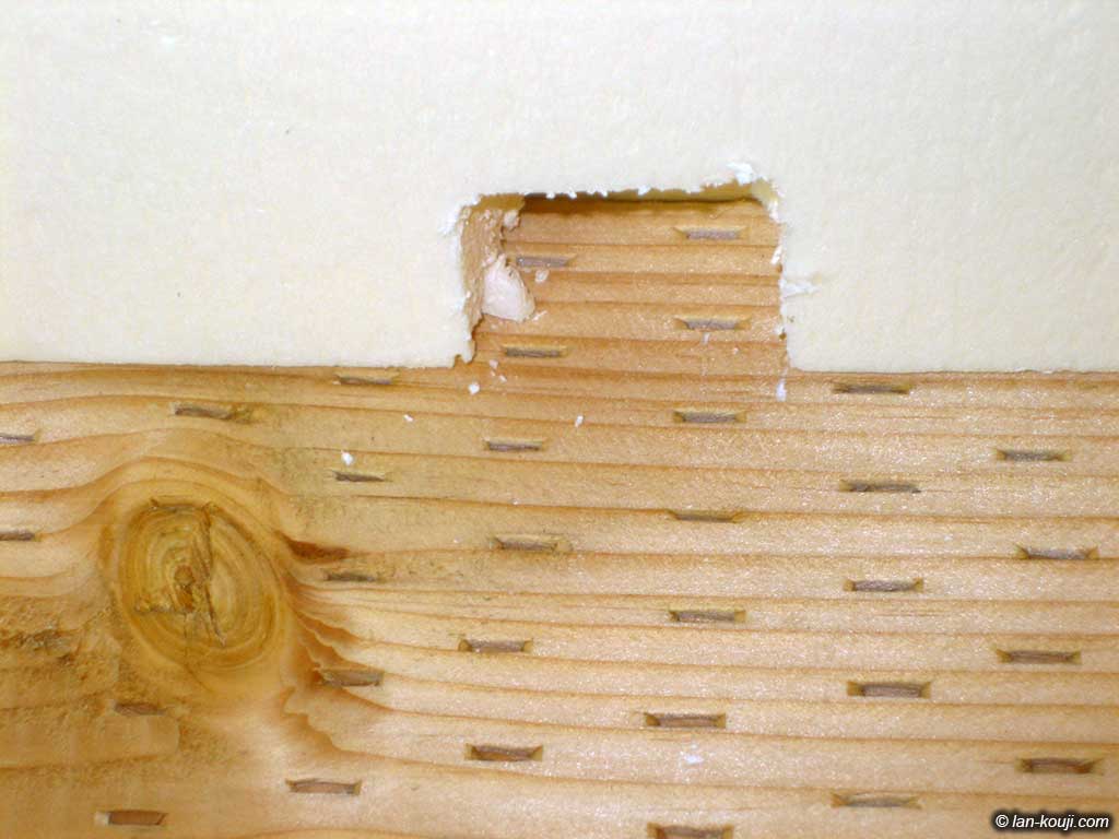 床下断熱材を穴あけに必要なスペース分適当にカットします。ここでは3~4cm角ぐらいでしょうか。 この断熱材は発泡スチロールなのでカッターか廻し引きノコギリでカットできます。柔らかい素材の場合は手でめくればいいので簡単です。 |