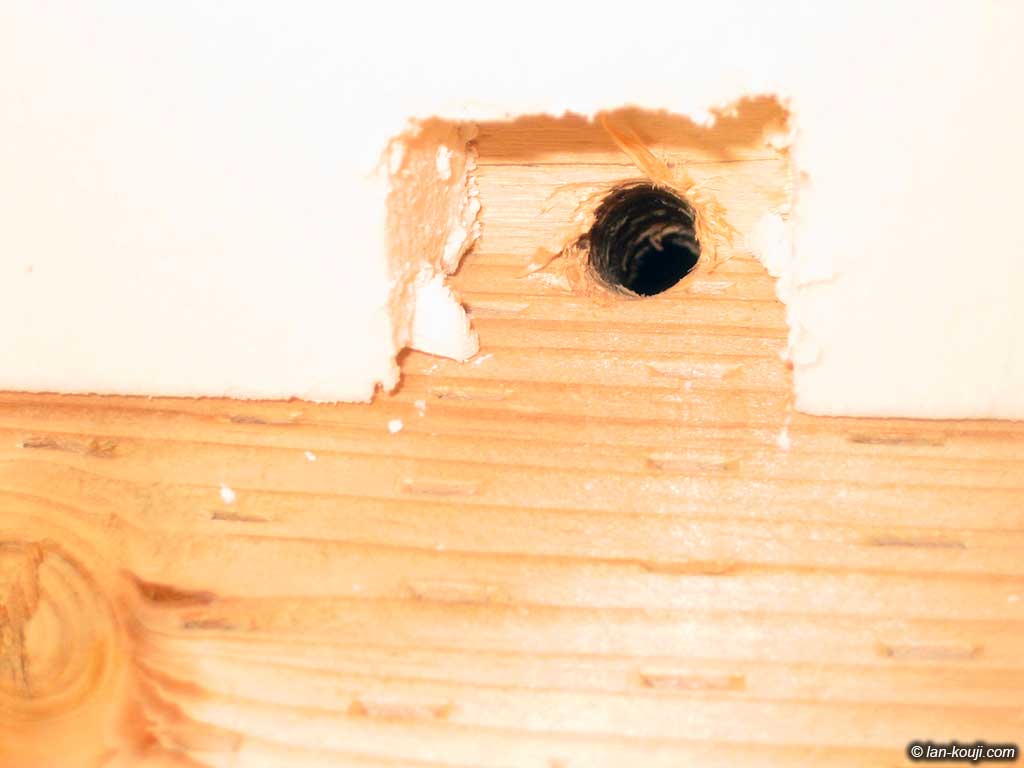 12mmの木工ロングドリルで下穴をあけます。ここは穴あけの角度がポイントになりますが、斜め下30~45度を目安にします。 ![]() 外壁の中に通じるようにイメージながら貫通させます。 |