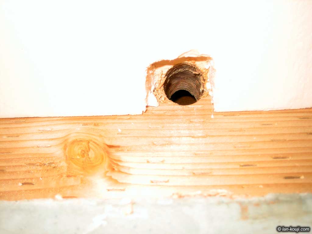 - 床下から居室に設置の電源コンセント部分に向かって穴あけをし、CD管を床下から立ち上げる