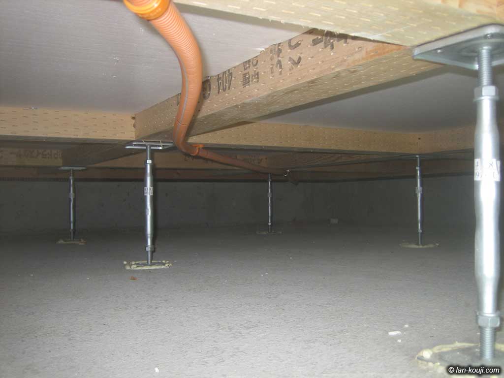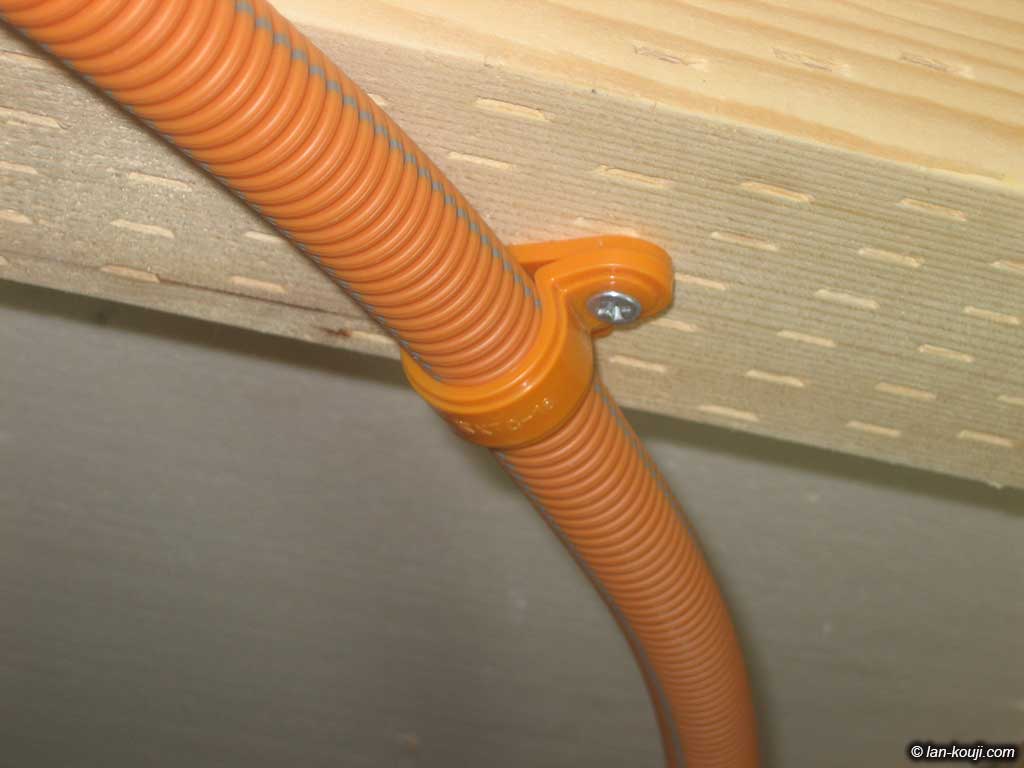 CD管を床下の天井面に片サドルで固定します。 後でLANケーブルを通線するときに固定してあることで作業がスムーズになります。 |