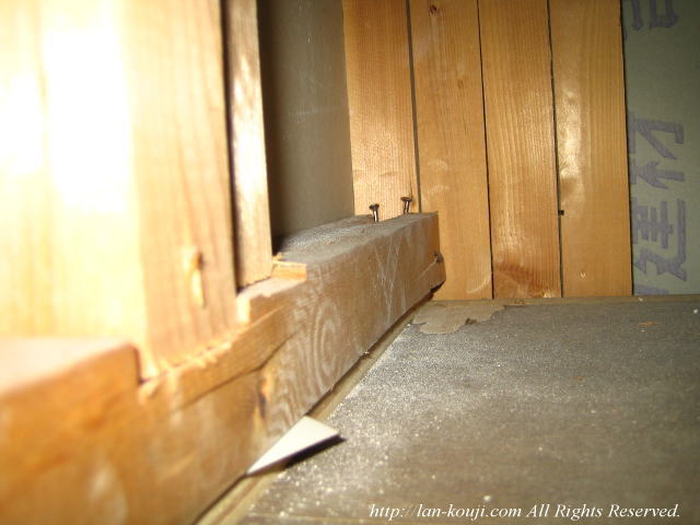 和室にある押入れ上部の中の様子です。位置関係は手前左側に設置した点検口があります。 LANケーブルを通したい部分に下地の壁ができています。これはどういう意味があるんだろう? |
