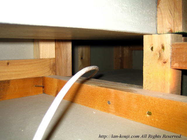 挿入したLANケーブルを点検口側から引っ張ります。 と言っても、開けた穴が大きくならないように和室側からゆっくりとケーブルを押し込んで、入った分だけ点検口から引っ張る、を繰り返しました。 適当な長さまで入ったら、点検口側に入ったLANケーブルを適当な長さに切断してコネクタを取り付けます。 |
