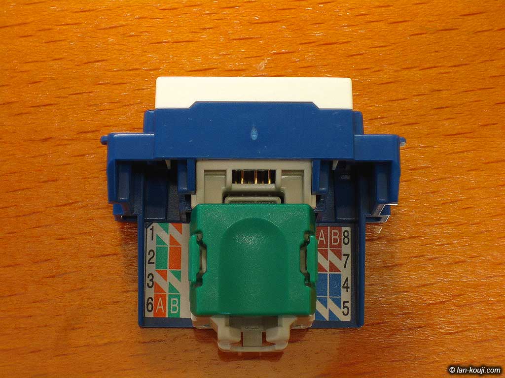 LANケーブルを結線する部分です。 ガイド表示がされています。A配線(T568A)とB配線(T568B)ではオレンジと緑が入れ替わりますが、わかりやすく表示されています。 |