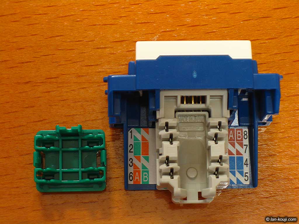 カバーを外したところ。 カバーを外すと、実際に結線するための端子が見えるようになります。そしてこの緑色のカバーは、LANケーブルの導線を端子に押し込む道具にもなります。 |