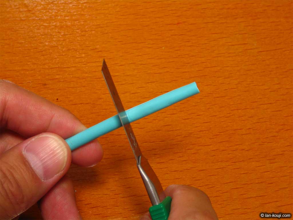 では実際にLANケーブルを接続してみましょう。 まずはLANケーブルの被覆をカットします。カットする長さは40mmぐらい長めにカットすると作業しやすいです。 |