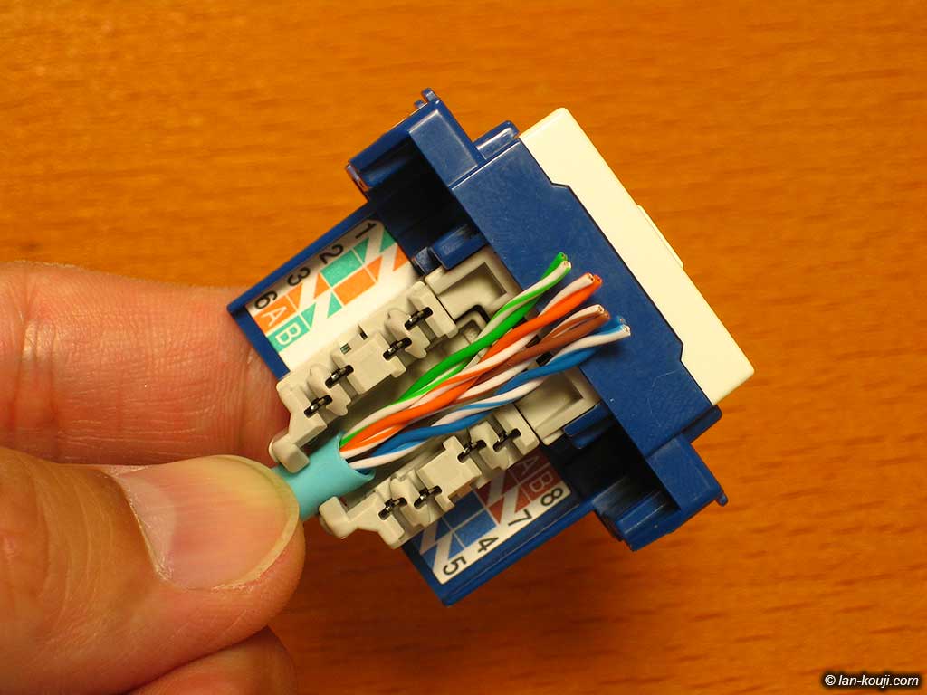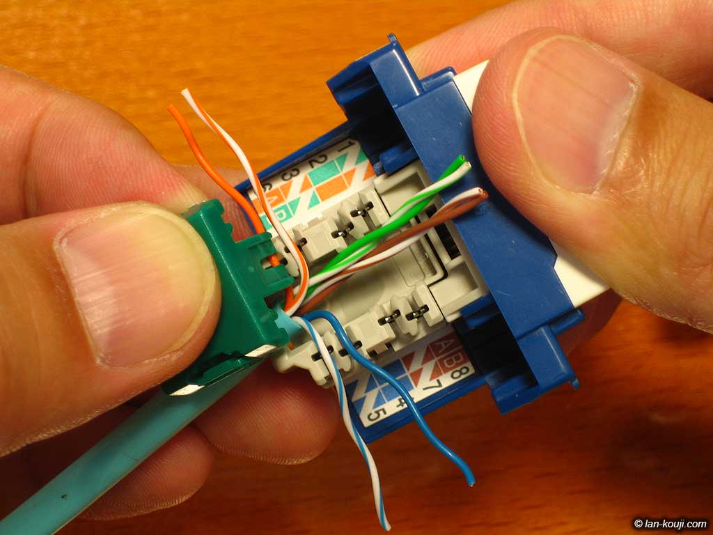 導線をガイドの色に合わせて端子に押し込んでいきます。 その際ケーブルから近いほうの導線から押し込んでいきます。理由は導線の露出部分をなるべく短くするためです。カバーを使って押し込むと「カチッ」という手ごたえがあります。正常に押し込めた合図です。 A配線とB配線では緑とオレンジ、白/緑と白/オレンジが反対になるので、ケーブルの反対側の端末処理に合わせてストレート結線になるようにします。 |