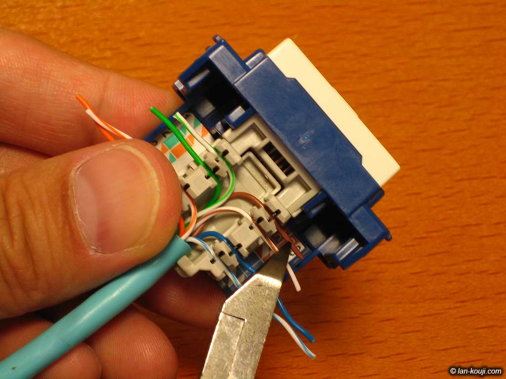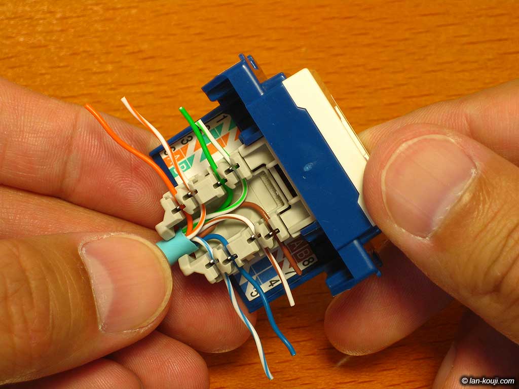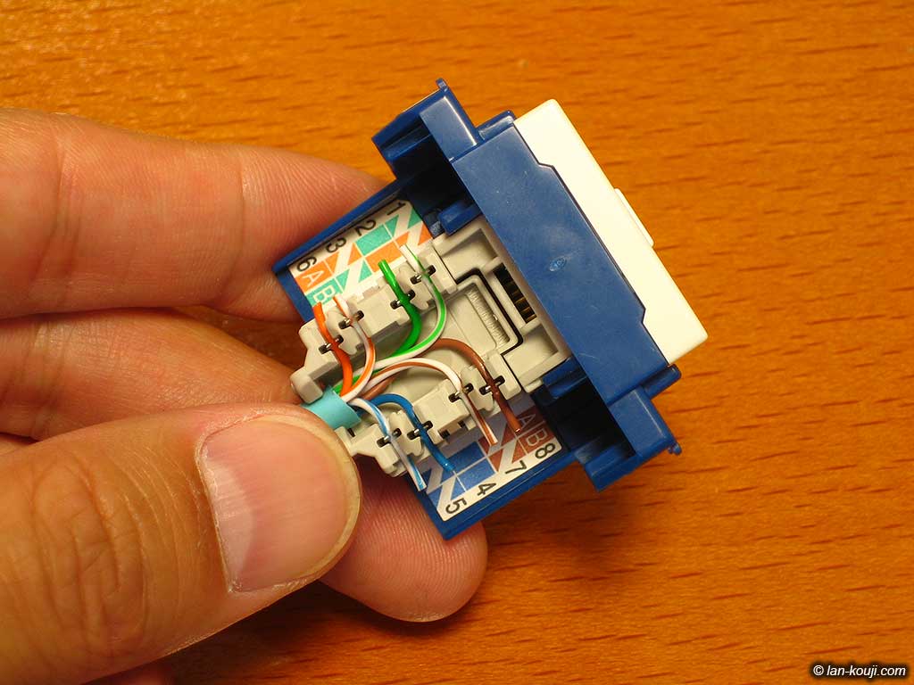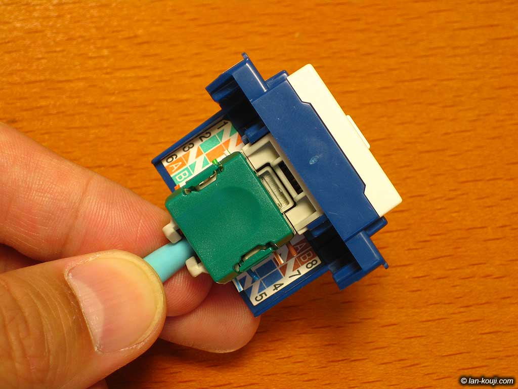 導線のヨリはそのままで、LANコンセントにケーブルをセット。ケーブルの入り口部分にケーブルを押し込むとケーブルが固定されます。 RJ-45コネクタを圧着する時のような、ヨリを真っ直ぐにする必要はありません。むしろヨリを戻してしまうと通信エラーの原因になるのでできる限りヨリはそのままで結線します。 |