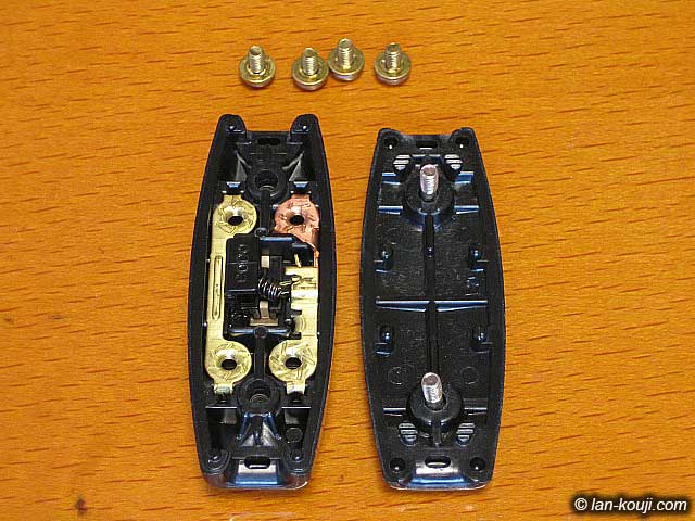 中間スイッチの内部の様子です。電源コードを接続するビス4本も外してあります。 写真を見るとわかりますが、2本ある回路の1本だけにスイッチが入っていてもう片方は直結になっています。このような構造のスイッチを片切(かたぎり)スイッチと呼びます。一般住宅の壁についている照明スイッチもこの構造のものがほとんどです。 |