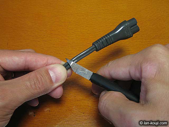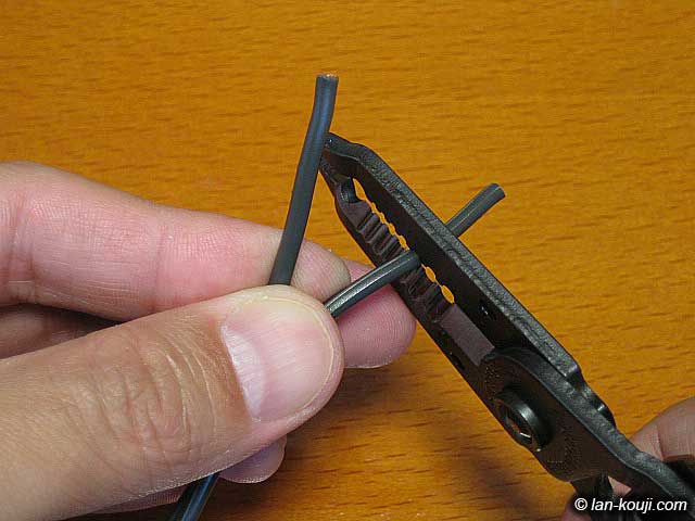 切断した電源コードのそれぞれについて外皮をむいて芯線を出します。 写真で使用している工具は外皮むき専用工具の |