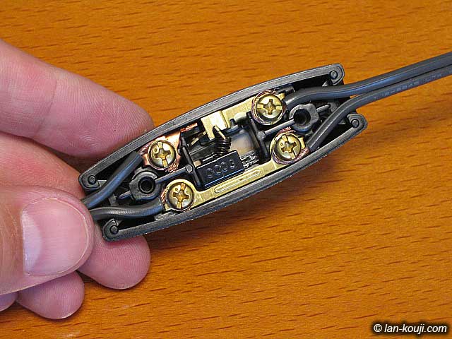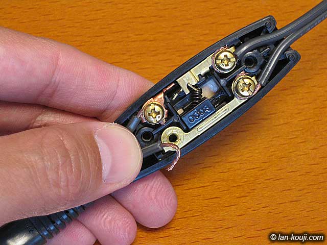 電源コード接続完了。 確認することとしては、引っ張っても容易に外れないこと、接続したときに余った芯線が隣りの端子まで飛び出たりしていないこと、です。 |