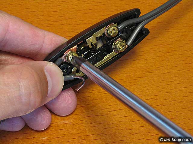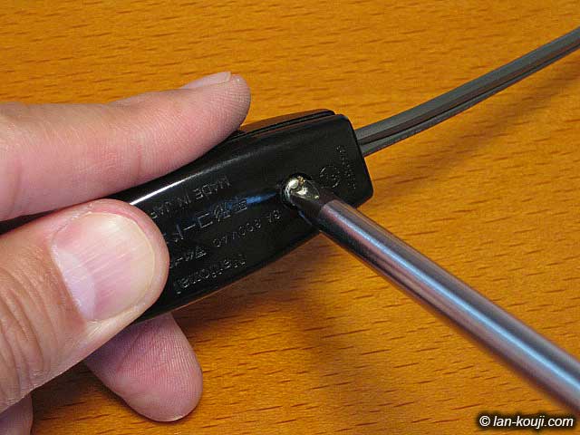 最後にフタを取り付けます。 フタは電源コードの被覆部分を押さえつける役目もしますので、締め込むのに多少力が必要です。 |