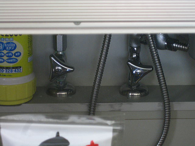 まずは水と湯の元栓をきっちり閉めて、レバーを上げても水が出てこないことを確認します。 引出しの奥にあるので少々やりにくいですが、手が届かないことはないです。 |