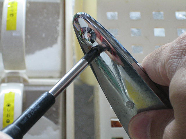 シャワーヘッドの上部分も汚いので分解します。 ネジを外しても取れないので見えている穴にドライバーを入れてこじ開けました。 |