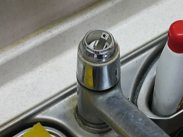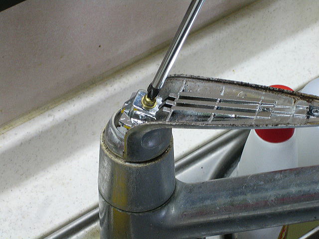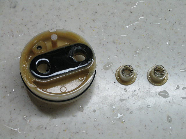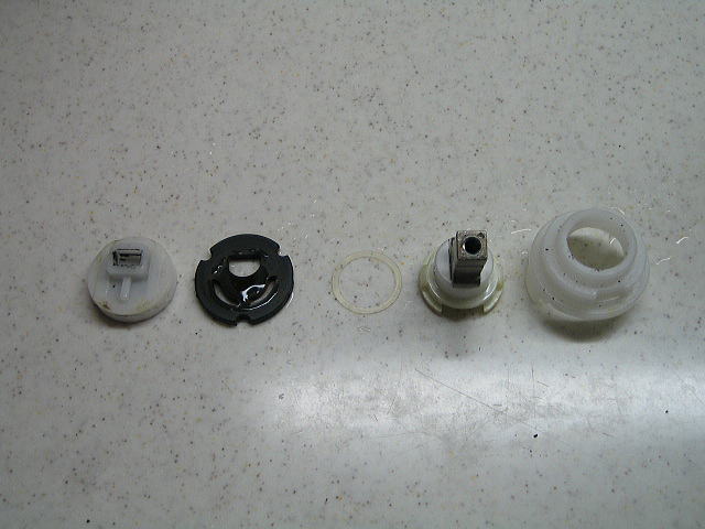 外したカートリッジ押えです。 水が乾いて残ったカルキがこびりついて硬い汚れになっています。この汚れを取るのに爪を立ててガリガリ削っていたのですが爪が負けました・・・仕方ないので車の内装を剥がすのに使うプラスチック製の「内張りはがし カートリッジを押さえつける力をネジる量で調節できるので、レバーの操作感を調節することができます。(あまりきつく締めすぎるとレバー操作が硬くなる) |