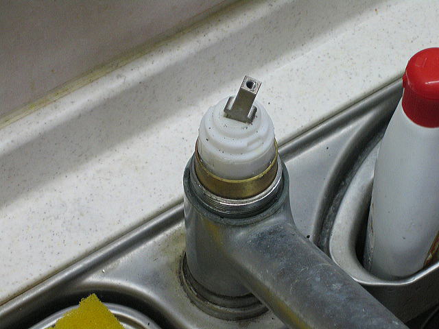 操作レバーが外れました。 中に見える白い部分はカートリッジという部品で、お湯と水を混合させるメイン部分です。 |