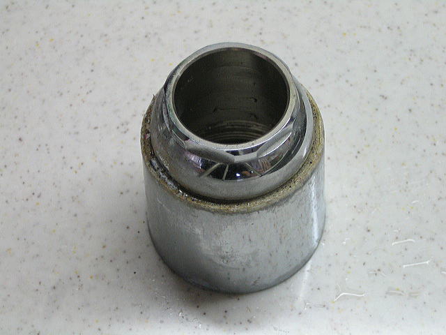 混合水栓のネック部分を外すことができました。 画像では分かりにくいですが、カルキの塊がエッジ部分に多量にこびりついています。塊を削り取ってからクリームクレンザー(カネヨン使用)で磨くことでキレイに落とすことができます。 |