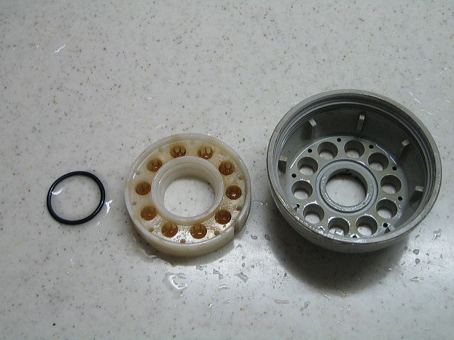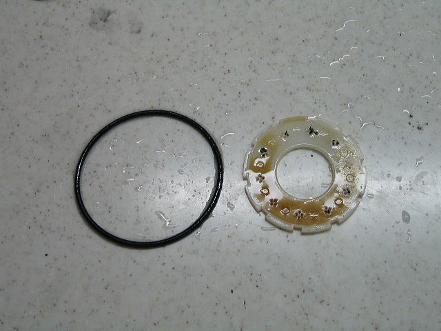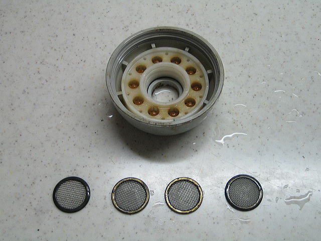 シャワーヘッドの上と下をシールドするOリングと整流板です。 整流板の小さい穴に金属のカスがついています。多分配管作業時にネジ切りしたカスが配管内に残っていたものと思われます。硬いので取り除くのに少し苦労しました。 |