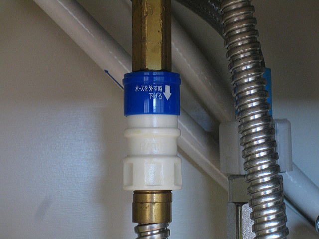混合栓のネック部分を外すために、シャワーホースを外します。 青い部分を下に下げることでホースを外すことができますが、混合水栓の中に水が残っているので外すのと同時に水が出てきます。下に洗面器や雑巾などで養生してから外します。 |