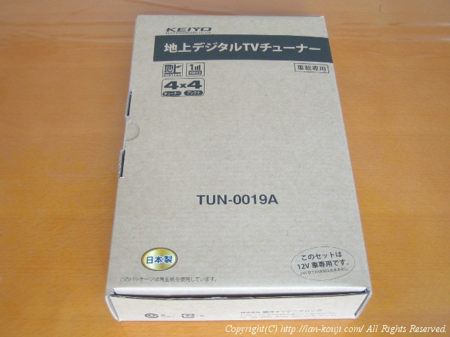慶洋エンジニアリング製車載用地デジチューナー「TUN-0019A」パッケージ。 簡単なパッケージでなんとなくエコっぽい雰囲気。 |