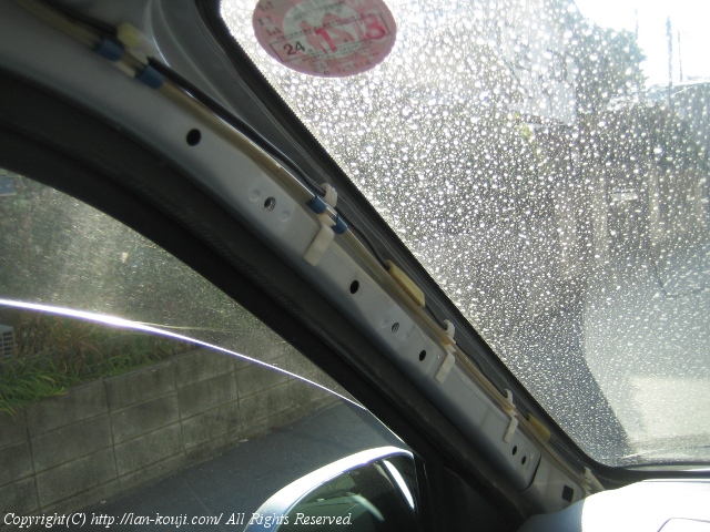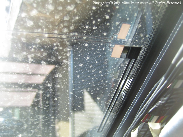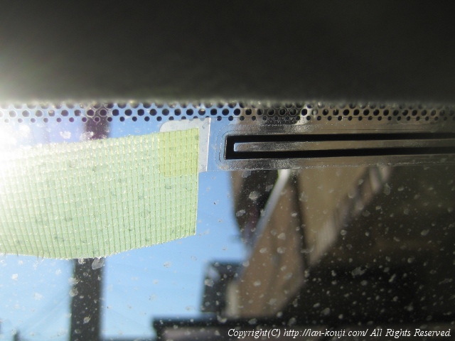 最初の段階としてセパレータが取れた部分だけを貼り付けます。 フロントガラスのふちにある黒い点々に平行になるように正確に仮貼りし、タオルなどで強く押し付けます。 |