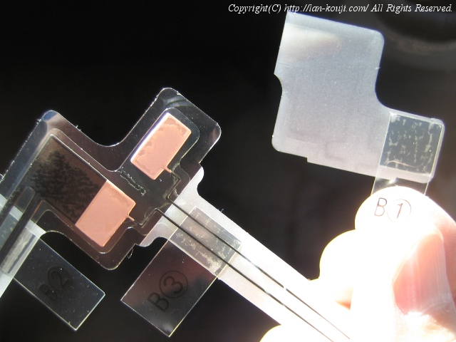 フィルムアンテナにはA1~A3、B1~B3のタグがついていて、タグを引っ張るとセパレータがはがれる仕組みになっています。AタグとBタグがついているものはアンテナの向きが逆になっています。 取付説明書の通りに、まずはB1のタグを持ってセパレータを外します。 |