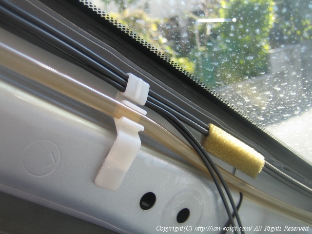 既に通っているケーブル類にあわせて、アンテナケーブルを適当に始末します。 ここは助手席側のAピラーで、ケーブルクリップがあるのでそこに2本アンテナ線を通していきます。 |