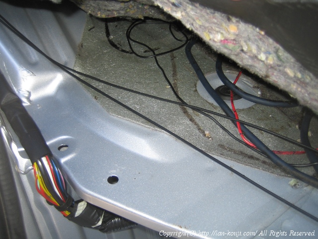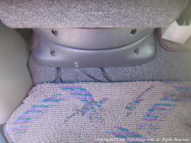 助手席足元のカーペットをはがしてアンテナケーブルを通します。 カーステやカーナビ関連のケーブルもゴチャゴチャ配線しています(^^)v |