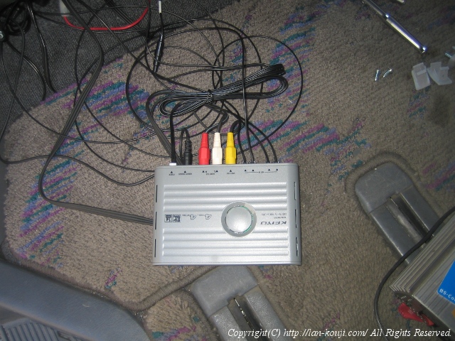 4本のアンテナケーブルとリモコン受信ケーブルを助手席下までもってくることができました。 チューナー本体にアンテナ、電源ケーブル、テレビのビデオ入力にビデオケーブルを接続します。 |