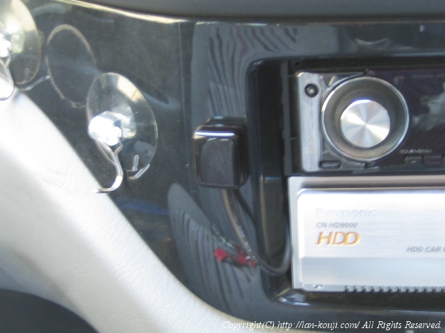 リモコン受信ユニットをヘッドユニット脇に設置します。 ユニットの裏に両面テープが貼ってあるのでそのまま貼り付け。コードはアンテナケーブル同様にカーペットの下を通しました。 |