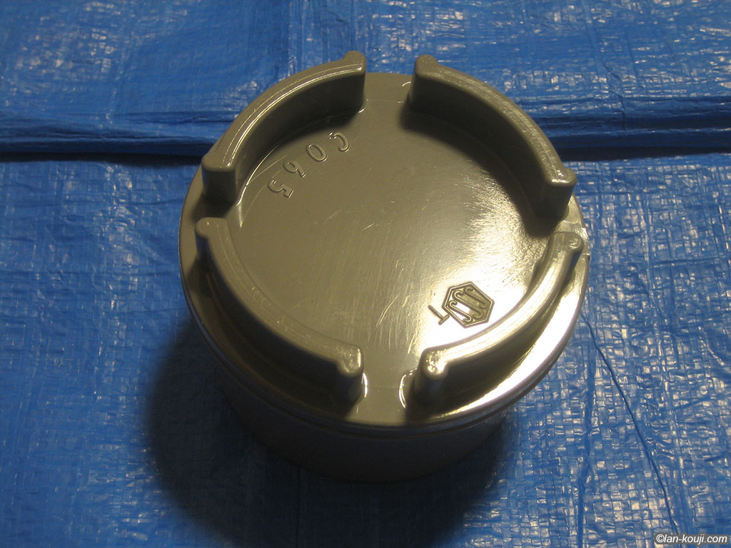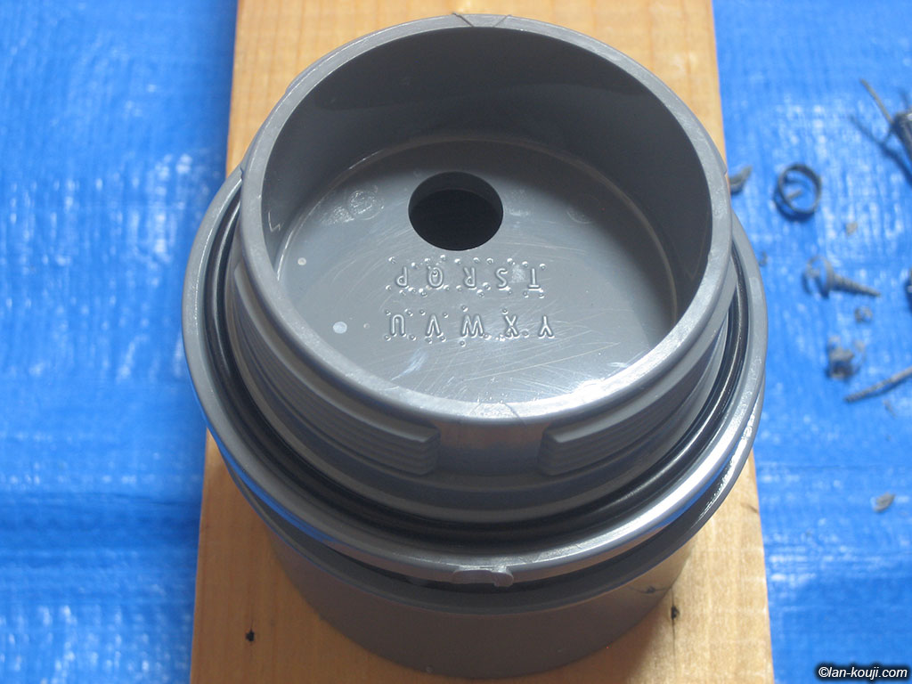 「ねじ式掃除口」のフタを開けたところです。 フタの内側に「Oリング」がついていて、キッチリと密閉することができます。これまた好都合。 |