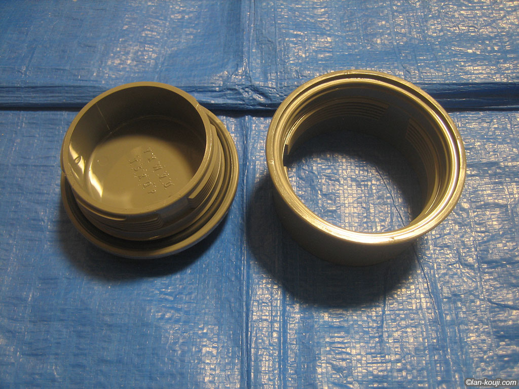 こちらは「ねじ式掃除口」という水道管(配水管)の部材です。ホームセンターで入手できます。 メーカーによって形・構造が違ってくるのですが、画像のものは「積水化学工業 型番NCO65」というものです。 |