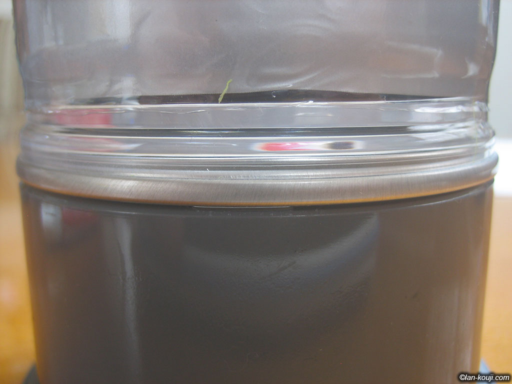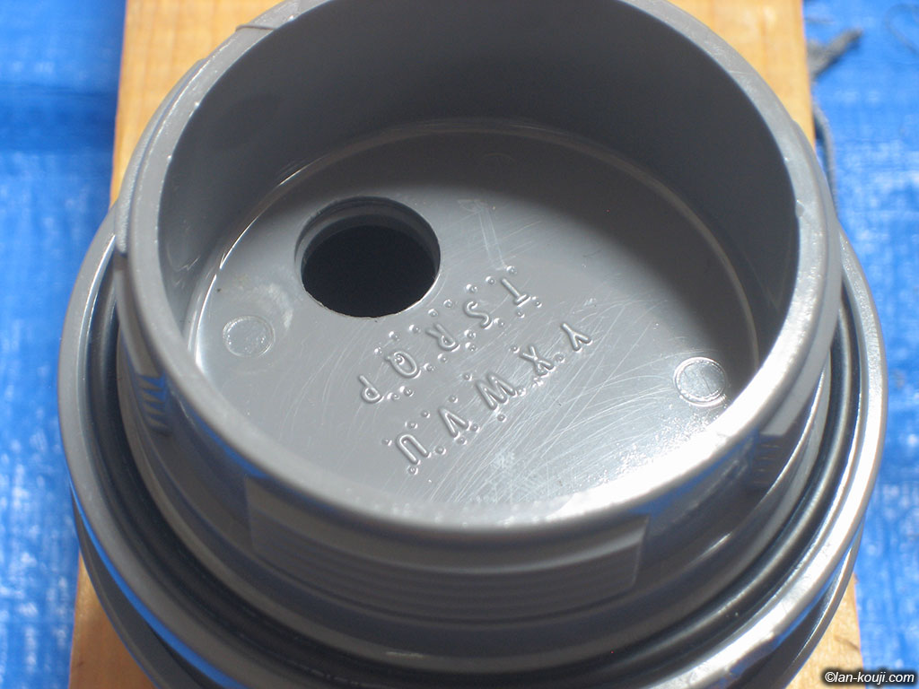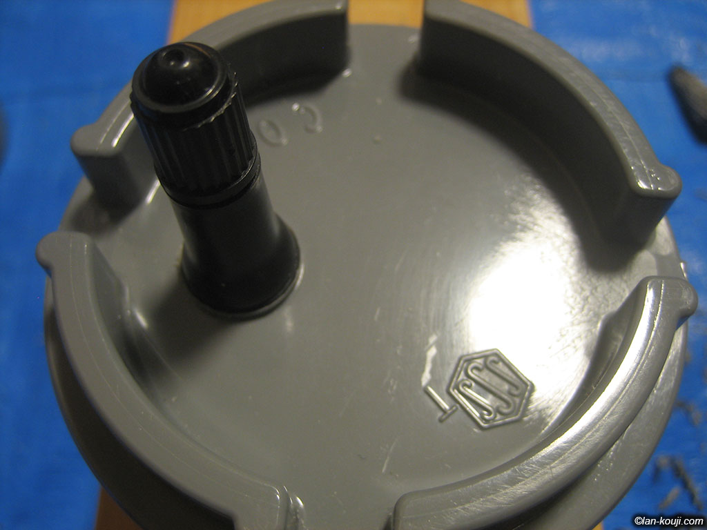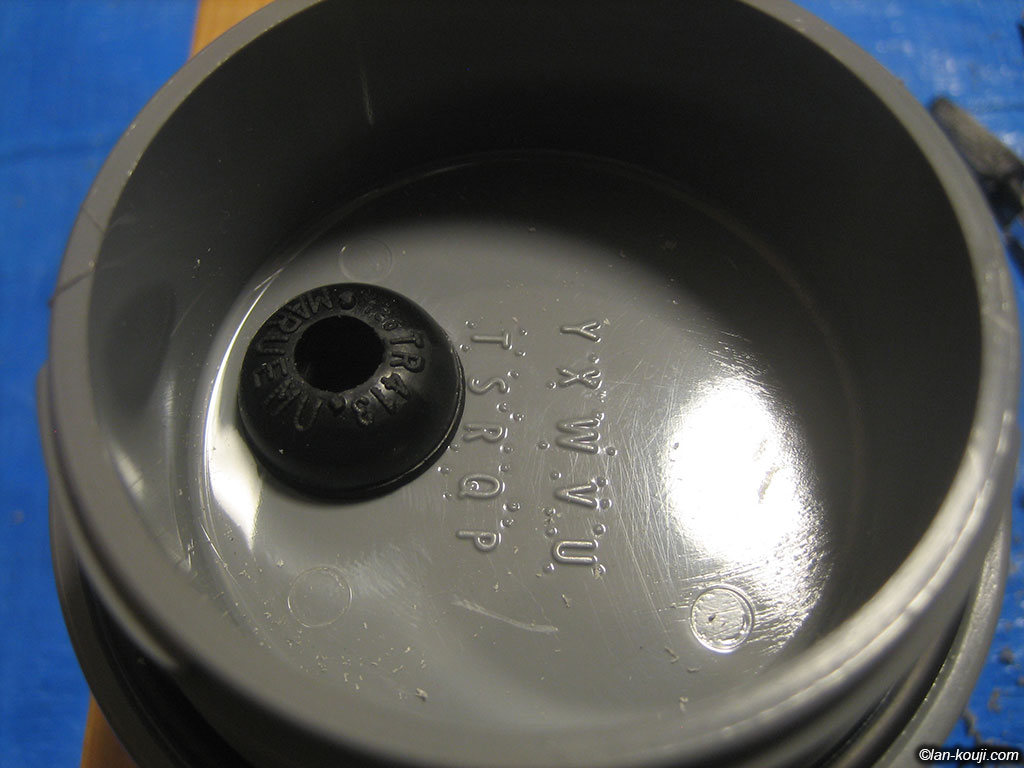 裏からも見てバルブが隙間なくセットされているか確認します。 ここまででフタの穴あけとバルブのセットは終了。次の工程に移ります。 |