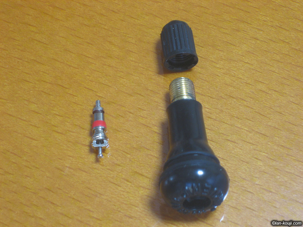 分解すると、本体・コアバルブ・キャップの三つのパーツに分かれます。 チューブレスバルブ自体は300円程度です。 |