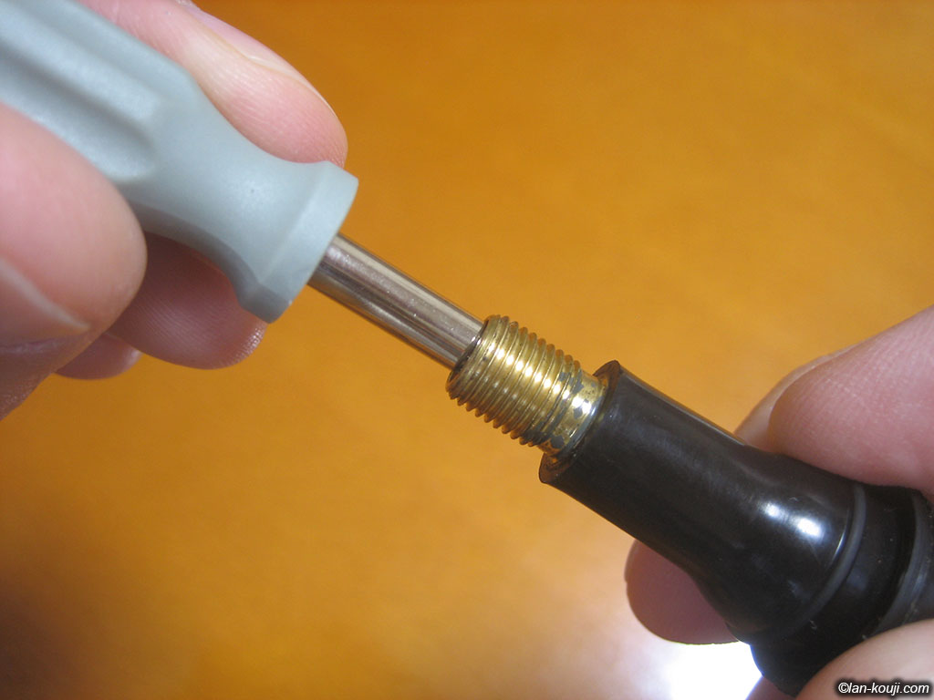 チューブレスバルブにコアバルブがセットされていなければ、あらかじめコアバルブをセットしておきます。 カー用品店などで入手する場合コアバルブがセットされていないこともあるので、そういった場合はコアバルブ用レンチが必要になります。 |