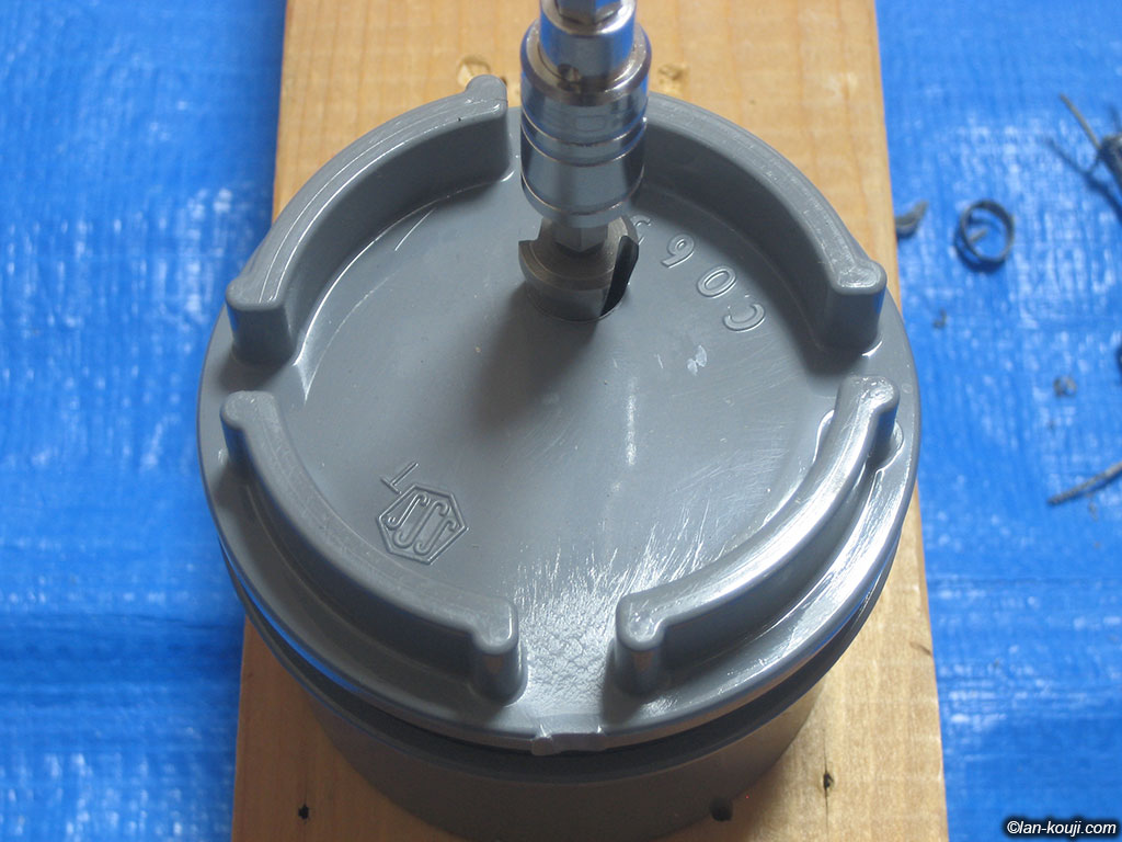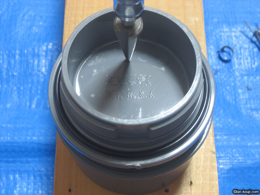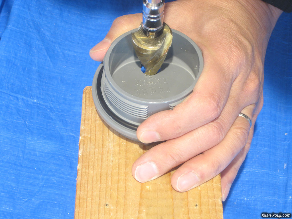 まずは、ねじ式掃除口のフタ部分にバルブを設置するため、14mmのスパイラルドリルを使って穴を開けます。 ねじ式掃除口のフタを開けて逆さまにし、土台部分に載せます。中心から少しずらした場所にスパイラルドリルをセット。中心からずらすのは、フタが硬くて開かない時に溝にドライバーなどを入れて開けられるようにするためです。 |