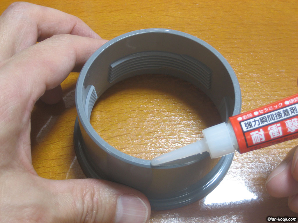 固定できたら、境目にぐるっと一周接着剤を塗ります。 塗り始めがどこだったかわからなくなるので、目印を決めて覚えておくといいです。乾燥は丸1日ぐらい掛けると完全に固定されます。 |