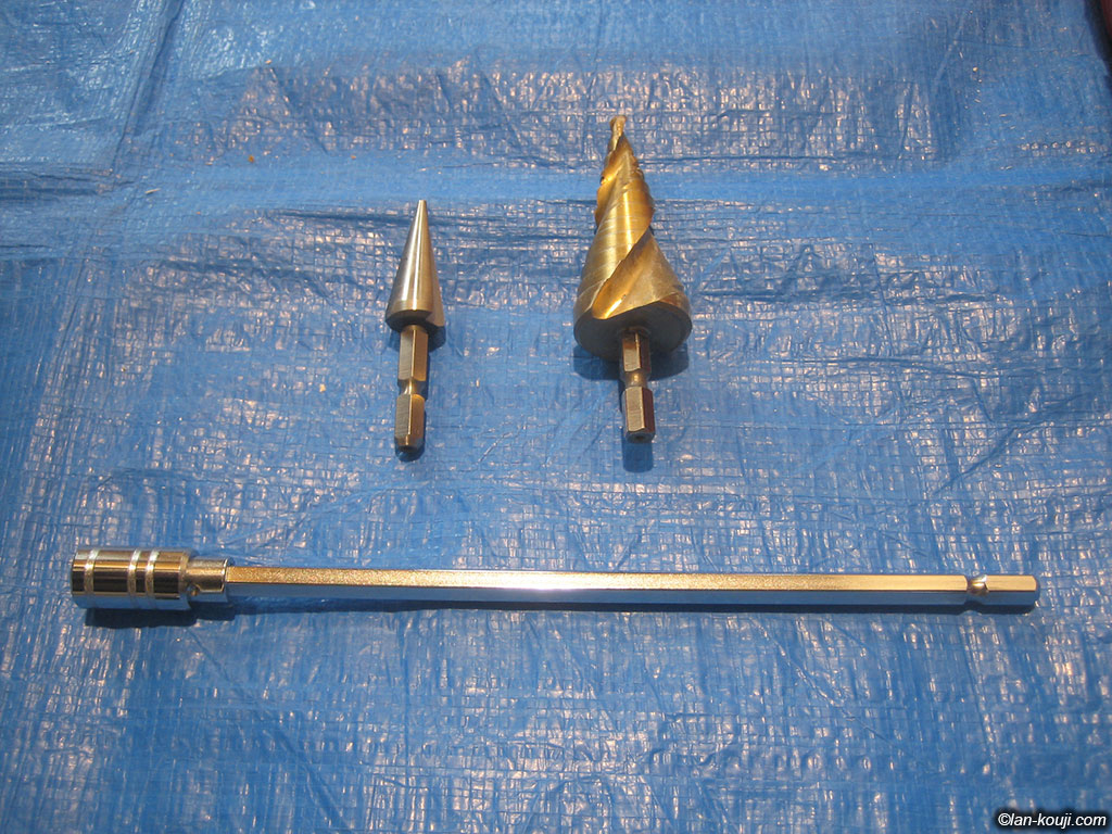スパイラルドリル14mmです。右はスパイラルステップドリル28mm。下は電動ドリル用エクステンションバー300mmです。 使用方法は後述で。 |