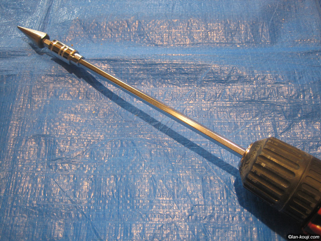 電動ドリルに装着するとこんな感じです。 ドリルビットをドリルに直接装着すると、ドリルのネック部分が邪魔になるのでエクステンションバーを使います。 |