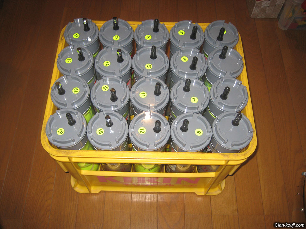 この保圧容器、太さが大瓶の瓶ビールとほぼ同じなのでビールケースに収納することができます。たくさん作った時の収納方法としてうってつけ。管理しやすいように番号シールを貼ってみました。ビールケースは酒屋さんやコンビニで300円の補償金を払えば譲ってもらえます。 ただし、高さが瓶ビールより高いので上がケースからはみ出してしまうのが難点。ケースを重ねることができません。あと、このままテニスコートに持ち込むと「飲みながらテニスするのか!?」って勘違いされます。 |