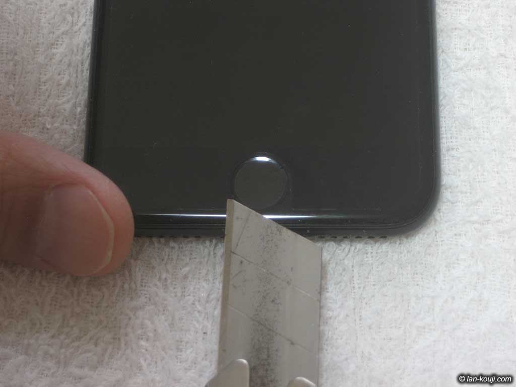 カッターでフィルムの端を浮かせます。 フィルムに傷がつかないように、ここは慎重に丁寧に時間を掛けましょう。 |
