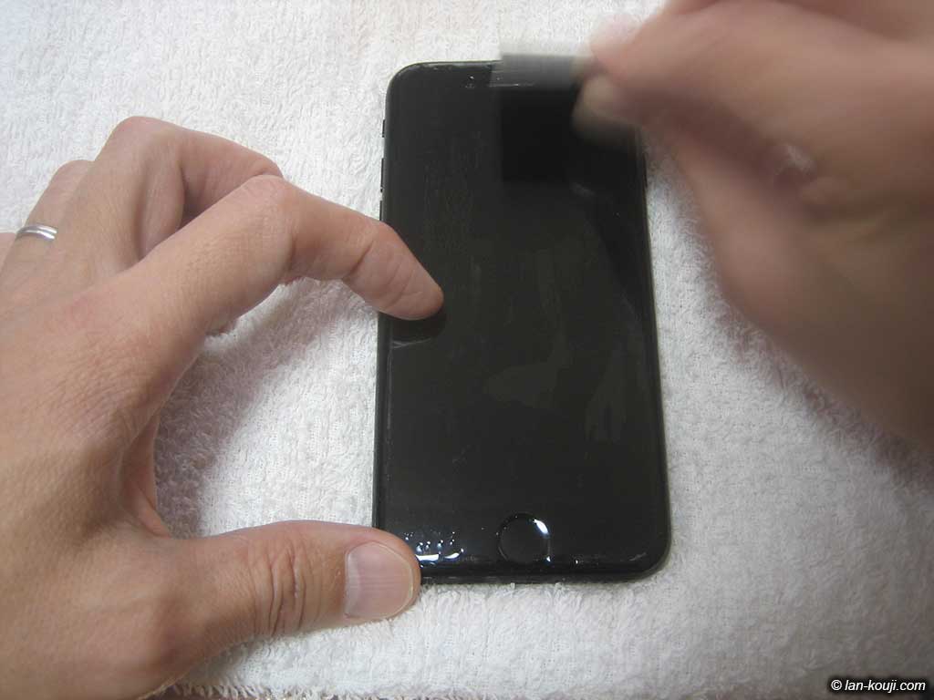 そのままフィルムを画面に乗せます。 フィルムと画面の間に水があるので簡単にずらすことができます。ゆっくり落ち着いて所定の位置に合わせます。 |