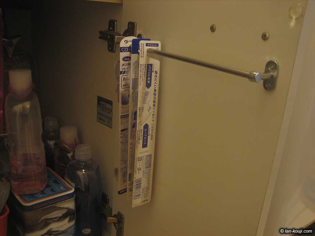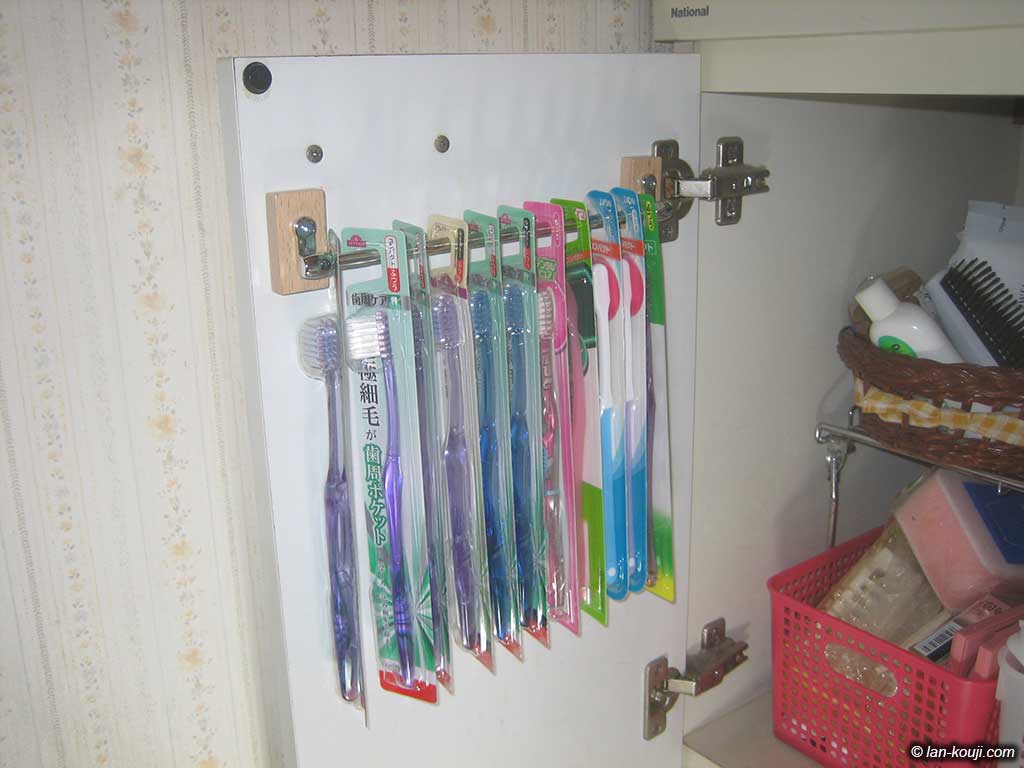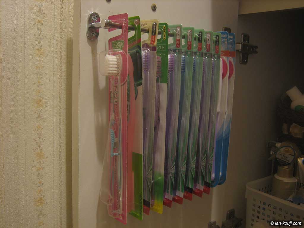 扉の裏にステンレスパイプを取り付けただけですが、歯ブラシの在庫状況が一目でわかって取り出しやすい。狙った通りの使い勝手で満足です。太さ6mmのステンレスパイプとブラケットを入手することがキモですかね。扉を閉めたときに中のものと干渉しないような位置に取り付ける必要があります。