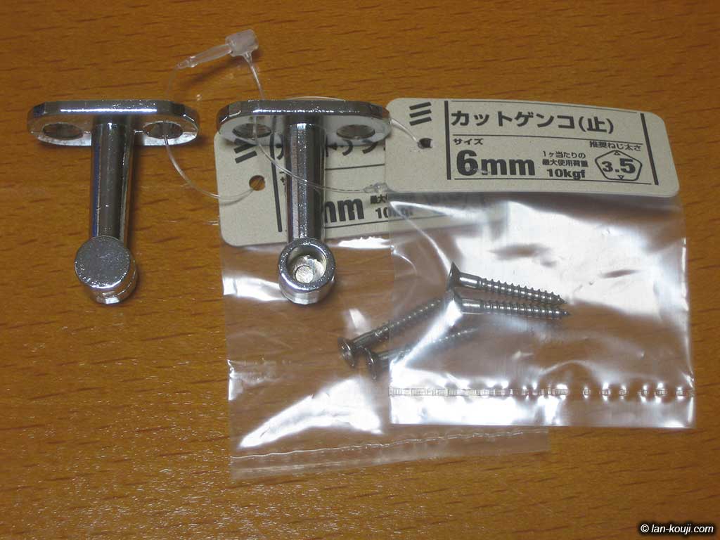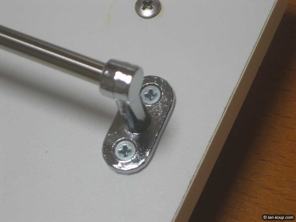 パイプにブラケットを付けてビスで固定。 扉はパーティクルボードなのでどの位置でも木ビスが効きます。なんと好都合な。 |