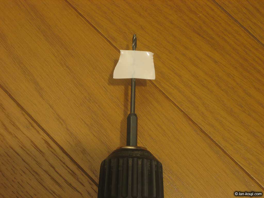 扉に直接ビスを打つので下穴を開けます。 ビスの長さより少し浅くなるような下穴になるようにドリルビットに目印を付けます。 |