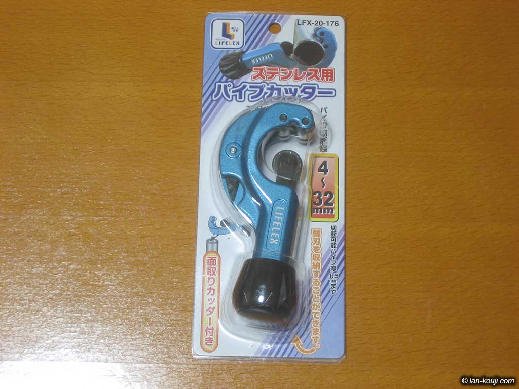 ステンレス対応のパイプカッターです。 使用方法は至って簡単。パイプをカッターに固定して刃を押し当て、カッターをぐるぐる回すだけです。今回は太さ6mmのパイプなので、カッターを回すとパイプも一緒に回ってしまって苦労しつつもなんとかカットできました。 |